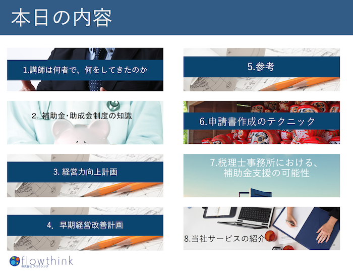 内容は補助金・助成金の基礎知識と、経営力向上計画や早期経営改善計画、営業トークや報酬金額のことなど、バラエティに富んだ内容で2時間、ひたすらしゃべらせてもらいました。 質疑応答でも活発な質問が飛び交い、また講義後もたくさんの方からお褒めの言葉をいただき、講師としては大変嬉しく思います。ありがとうございました。