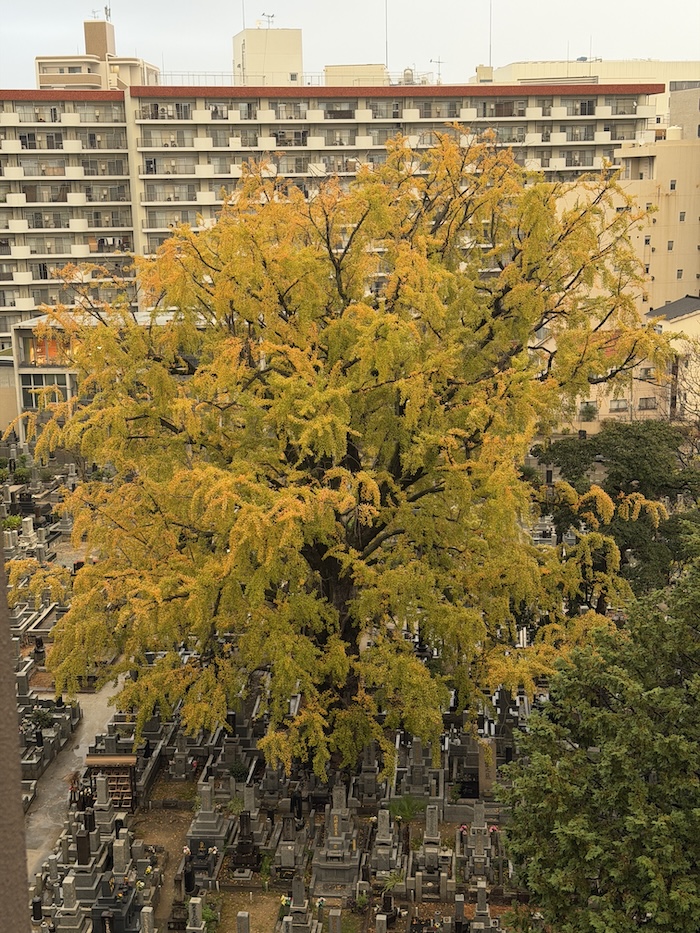 できれば葉が落ちる前に、墓地に入って真下からこの木を見上げてみたい・・・と、ここに事務所を移転した最初の秋からそう思っている。今年こそは実現できるだろうか。